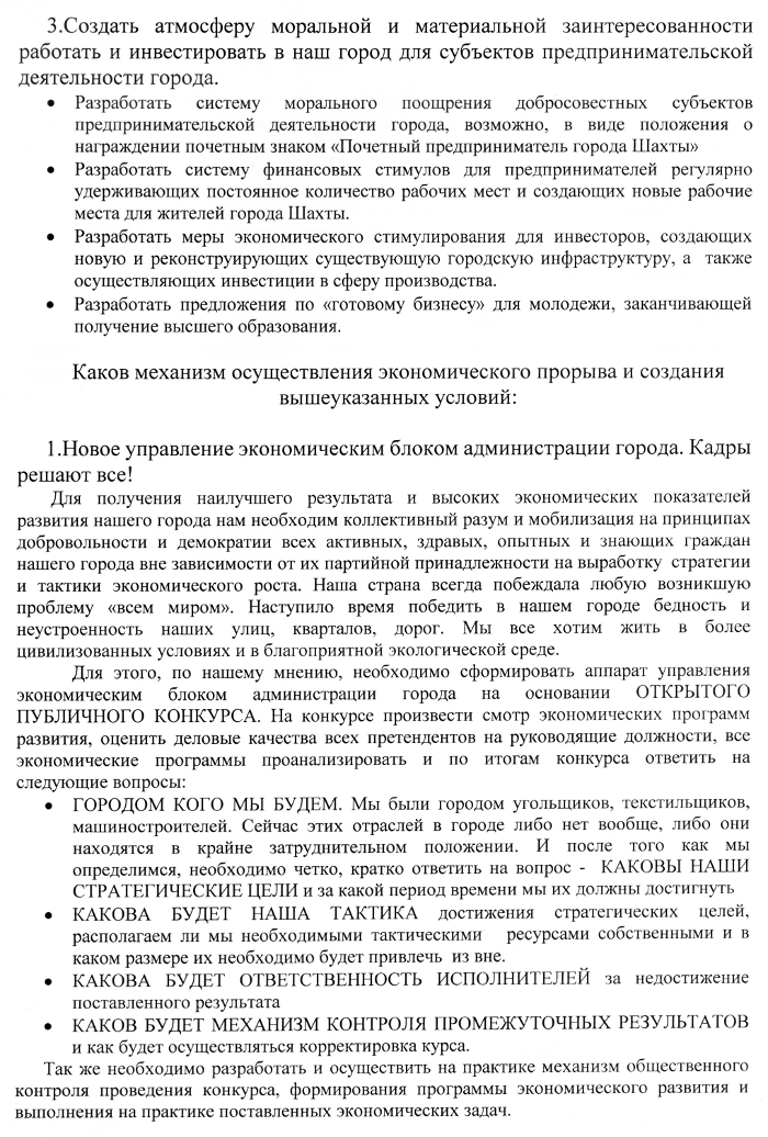 Озвучивая перечень идей и предложений главе города, Сергей Першин акцентировал внимание на создание атмосферы доверия между бизнесом и властью - превратить город Шахты в территорию справедливости и законности. Сергей Анатольевич выразил мнение по вопросу создания условий для повышения конкурентоспособности местных субъектов предпринимательской деятельности, системе морального поощрения добросовестных предпринимателей и протекционизме для местных предприятий. Он говорил о необходимой свободе городской прессы, которая в последнее время часто ощущала на себе давление со стороны чиновников. Предложил формировать аппарат управления экономическим блоком администрации города на основании открытого публичного конкурса, что может привести к притоку высококлассных специалистов. Также озвучил идею о возможности создания в городе кластера в сфере ЖКХ - современную управляющую компанию полного производственного и технологического цикла с широкой географической сферой деятельности и многое другое.