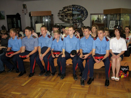 В заседании патриотического клуба "Колокола памяти" приняли участие студенты факультета начального и общего среднего образования ЮРГУЭС, кадеты казачьего корпуса имени Бакланова, школьники, шахтинские поэты и прозаики