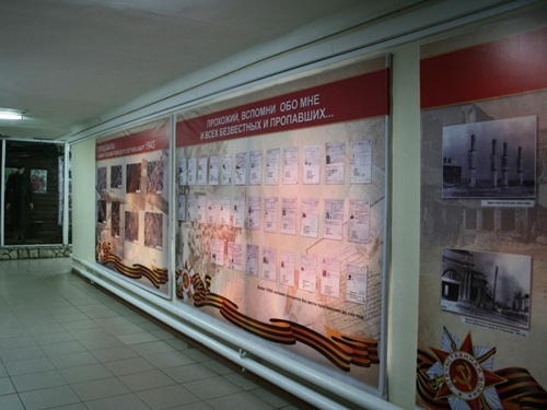 Особая гордость института – точные копии знамён Победы и 40 гвардейской стрелковой дивизии, освобождавшей город Шахты. Обе реликвии также стали ценными экспонатами патриотической выставки. Здесь же размещены фотографии военных лет. Отдельные стенды рассказывают о периоде оккупации города, героях-шахтинцах и волонтёрской работе с ветеранами.