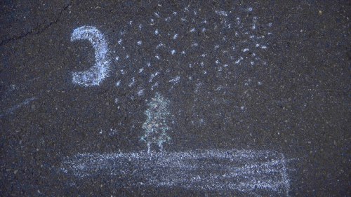 Пейзажи тут вовсе не следят за календарём, а потому среди знойного лета чья-то увлечённая ручонка нарисовала новогоднюю ёлочку и чудесный месяц, который, кажется, вот-вот спрячет в мешок диканьковская Солоха.