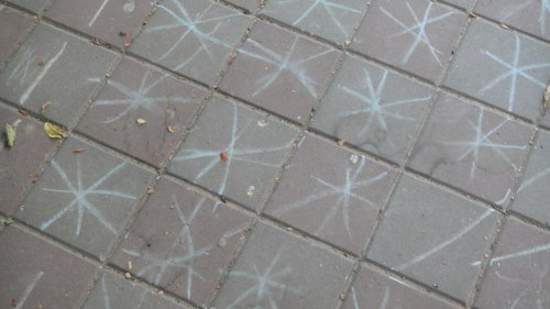 На городских плиточках листва перепуталась с чьими-то снежинками: