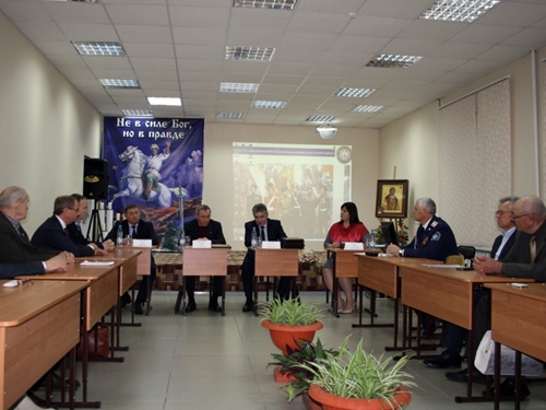 На базе Шахтинского Я.П. Бакланова кадетского казачьего корпуса состоялась встреча членов Общественной палаты города Шахты с руководителем Общественной палаты Ростовской области Вячеславом Кущевым и его заместителем Юрием Зерщиковым.