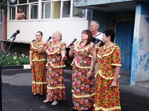 Вчера творческие сотрудники красинского клуба гостили на улице Хабарова, поздравляли её жителей с наступающим Днём города и Днём шахтёра. Зрители охотно подпевали всеми любимые песни, которые исполнял ансамбль народной песни "Криницы", с удовольствием смотрели выступление детской студии танца "Звездный дождь".
