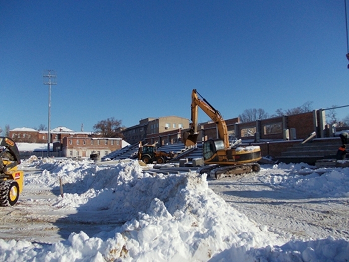 Однако уже в 2014 году работы стали явно отставать от графика. Итогом года стала недостроенная восточная трибуна, установка мачт с осветительным оборудованием и светодиодного табло. В конце концов реконструкция стадиона была, по официальному выражению "заморожена", а фактически брошена.