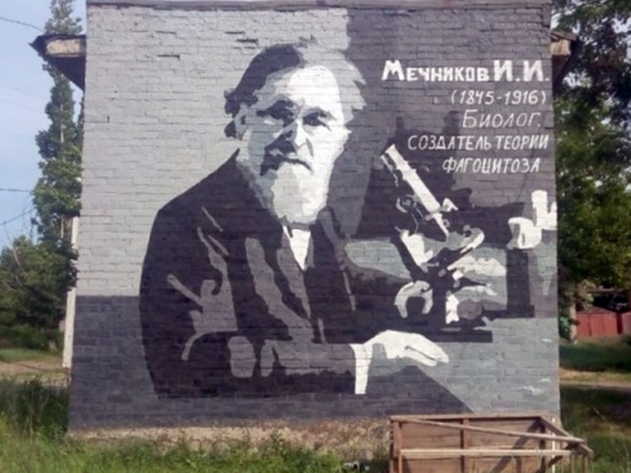 В Шахтах, оказывается, есть свой райтер, работающий в том же направлении. Он украсил стену на улице Мечникова портретом того, чьё имя эта улица носит. Чёрно-белое изображение Ильи Ильича Мечникова — русского биолога, удостоенного в 1908 году Нобелевской премии в области физиологии и медицины, выполнено с помощью трафарета на основе фотографии, взятой из интернета. Тут же автор разместил и краткую информацию о Мечникове.