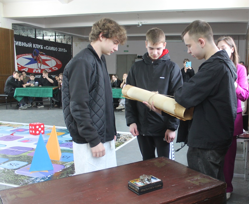 Назвали игру "По следам народов России" и пригласили поучаствовать ребят из школы N32, которые разделились на три команды. Команда-победительница, которой удалось первой добраться до финиша, получила ключ от сундука, где хранился заветный артефакт "Свиток единства" - на его основе все участники игры создали общую композицию.