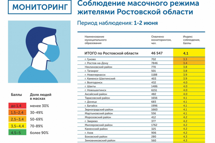 По данным Роспотребнадзора, за последние сутки в Ростовской области выздоровело 25 человек. За весь период в области выздоровели уже 1742 заболевших. Число подтверждённых инфицированных коронавирусом увеличилось на 184 и по состоянию на утро 1 июня достигло 4942. Показатель заболевших коронавирусом на 100 тысяч населения – 117,6. Коэффициент распространения инфекции – 0,9.
