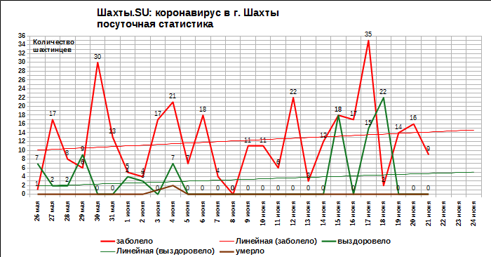 За весь период заразились 510 шахтинцев, в том числе за последние сутки - 2. Показатель заразившихся - 221 на 100 тысяч шахтинцев при региональном показателе заразившихся коронавирусом - 224,2. Показатель распространения заразы по Шахтам составляет 0,41 при областном показателе - 0,83. Остаются носителями заразы 25 шахтинцев.