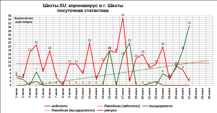 На коронавирус за всё время "эпидемии" обследованы 10769 человек. Оказались здоровыми 8212 человека, включая 170 человек, результаты обследования которых получены 27 июня. Результаты, подтвердившие заражённость, получены сегодня в отношении 2 шахтинцев. Ожидается получение результатов анализов 2045 человек.