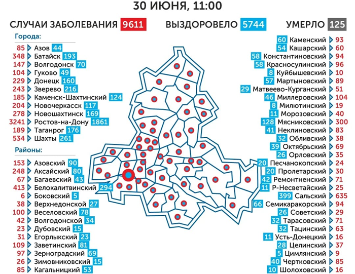 Новые инфицированные зарегистрированы в 33 городах и районах региона: в Ростове-на-Дону (37), Белокалитвинском (19), Сальском (15) районах, Шахтах (13), Каменске-Шахтинском (10), Багаевском (9), Мясниковском (9), Чертковском (8), Целинском (7) районах, Донецке (7), Миллеровском (6) районе, Новочеркасске (5), Советском (5), Красносулинском (5), Тацинском (4), Весёловском (3) районах, Таганроге (2), Звереве (2), Волгодонском (2), Заветинском (2), Тарасовском (2) районах, Батайске (1), Волгодонске (1), Гуково (1), Азовском (1), Октябрьском (1), Матвеево-Курганском (1), Зерноградском (1), Аксайском (1), Шолоховском (1), Песчанокопском (1), Боковском (1), Верхнедонском (1) районах.