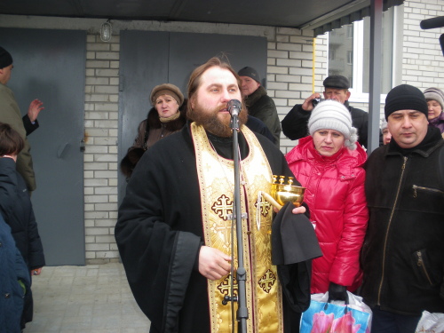 Настоятель Собора Покрова Пресвятой Богородицы Отец Георгий освятил новый дом и дал напутствие жильцам - жить в мире, дружбе и согласии.