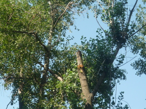 А на днях сотрудники УК "Коммунальщик-3" проводили собрание с жильцами дома N 13. Во время мероприятия неожиданно обломилась и упала сухая ветка на крышу дома, частично разрушив кирпичную трубу. Кирпичи посыпались с крыши во двор, лишь чудом никого не задев. Но даже после этого случая, не последовало никаких действий - аварийные деревья так и остались на месте, угрожая жизни прохожим.