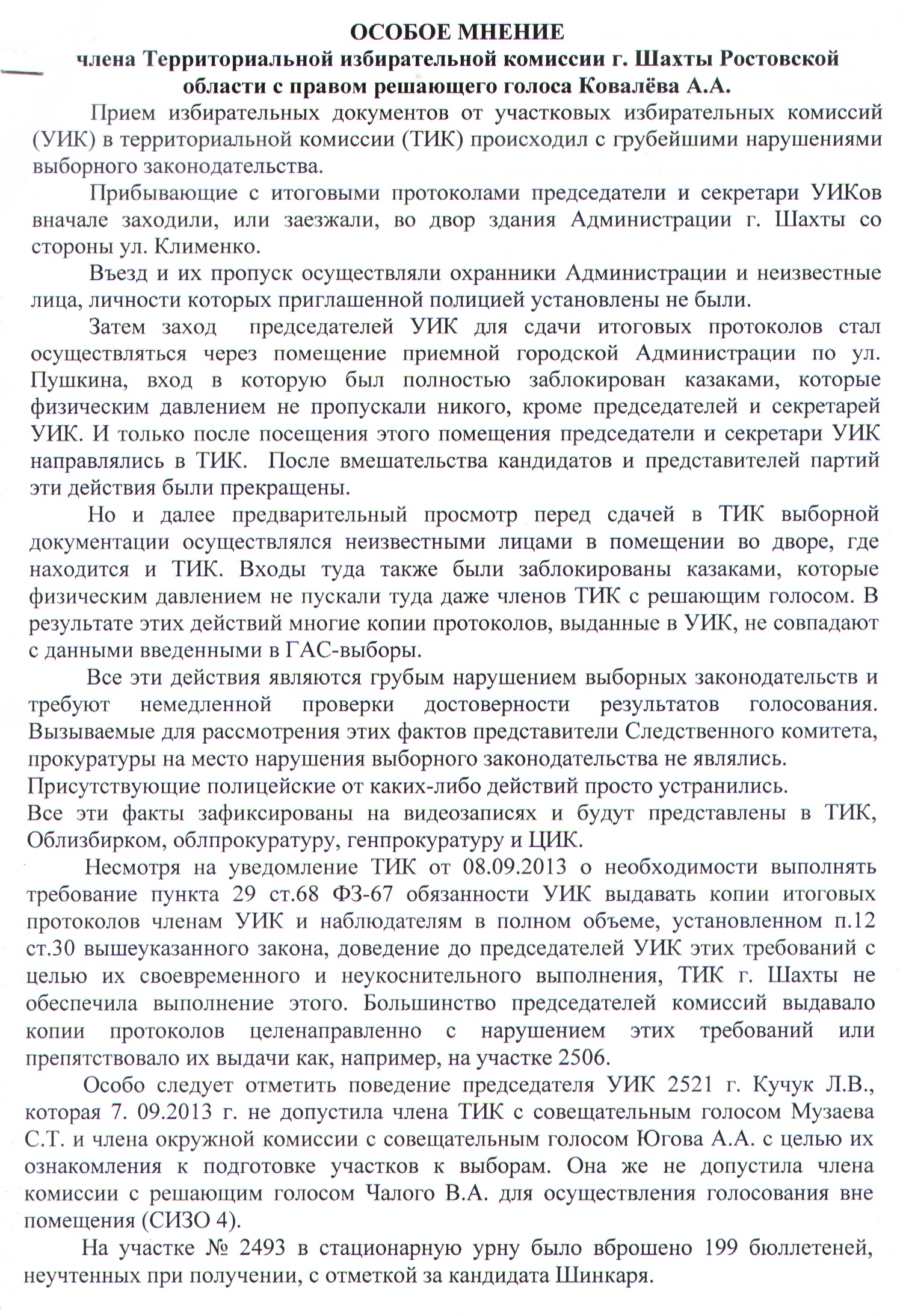 Несмотря на уведомление ТИК от 08.09.2013 о необходимости выполнять требование пункта 29 ст.68 ФЗ-67 обязанности УИК выдавать копии итоговых протоколов членам УИК и наблюдателям в полном объеме, установленном п.12 ст.30 вышеуказанного закона, доведение до председателей УИК этих требований с целью их своевременного и неукоснительного выполнения, ТИК г.Шахты не обеспечила выполнение этого. Большинство председателей комиссий выдавало копии протоколов целенаправленно с нарушением этих требований или препятствовало их выдачи как, например, на участке 2506.
