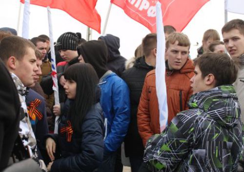 Тысячи работников-бюджетников, которые, не понимая толком, зачем они сюда пришли, держали плакаты, нарисованные впопыхах на старых обоях. Здесь же стояли студенты из всех ростовских вузов. Многие даже не разворачивали принесённые российские флаги. По словам студентки второго курса ростовского медицинского университета Анны К., на митинг она пришла после устного приказа в вузе.