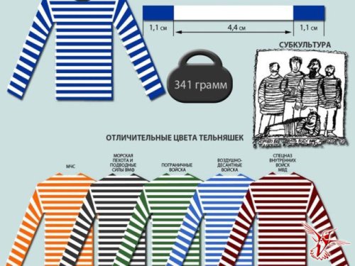 в 90-х годах прошлого века тельняшка прочно завоевала гардеробы служащих различных войск. Флоту оставили классические темно-синие полоски, васильково-голубые достались спецназу ФСБ, оранжевые - МЧС, зеленые - пограничникам. Появились и сезонные версии: летние полосатые майки, зимние теплые тельняшки с начесом.