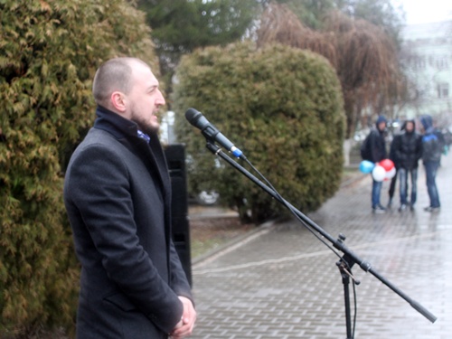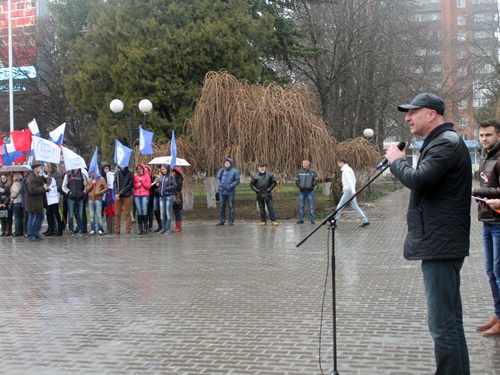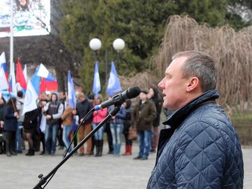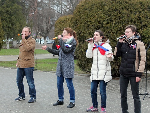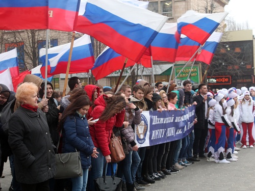 Кратким, но очень энергичным получился молодёжный митинг на центральной площади города Шахты, посвящённый второй годовщине вхождения Крыма в состав Российской Федерации. Из-за дождя, перешедшего в ливень, всё продлилось меньше получаса. Но этот небольшой промежуток времени вместил и аудиозапись поздравления президента России Владимира Путина с возвращением Крыма в родную гавань, и Гимн России, и выступления замглавы администрации Дмитрия Кравцова, депутата городской Думы Владимира Правдюка, председателя молодёжного парламента Ярослава Стурова, песню в исполнении вокального ансамбля "Ассорти" и зажигательный танец MATRIXа, к которому присоединились стоящие в колоннах студенты.