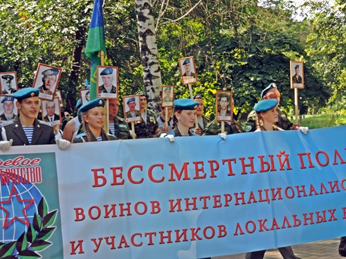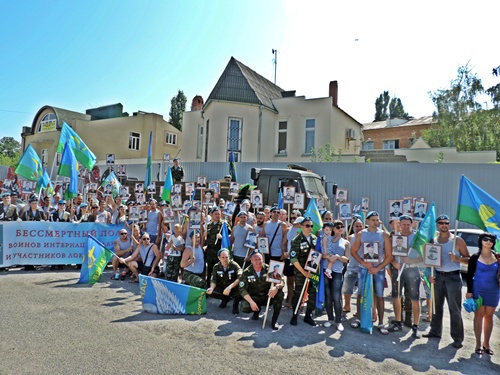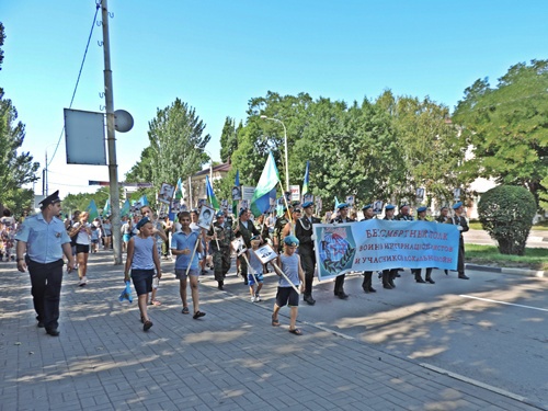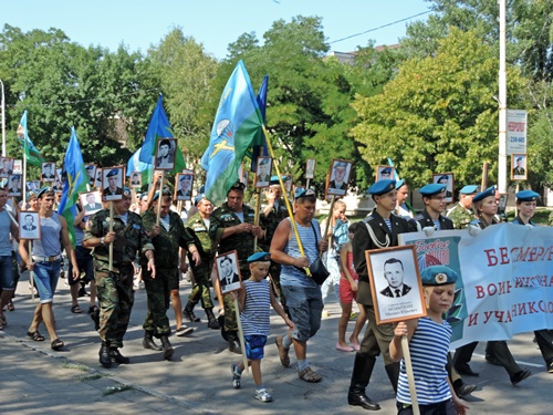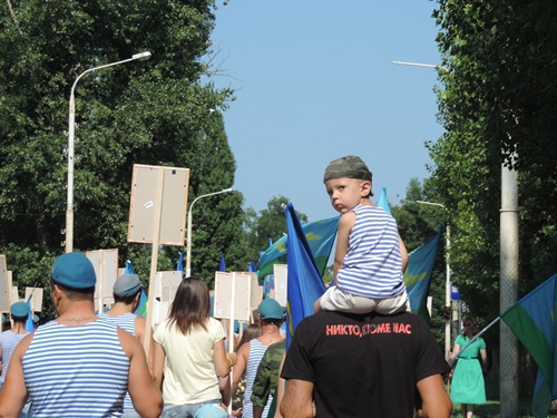После тожественной части было шествие "Бессмертного полка крылатой пехоты", в котором приняли участие и ветераны ВДВ, и их юные наследники. Мальчишки в десантных тельняшках с гордо поднятыми головами несли портреты героев-десантников, погибших в Чечне. Несмотря на жару, они двигались в колонне рядом со взрослыми весь путь, который был довольно продолжительным.