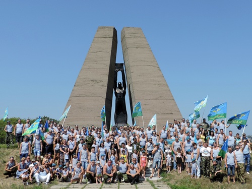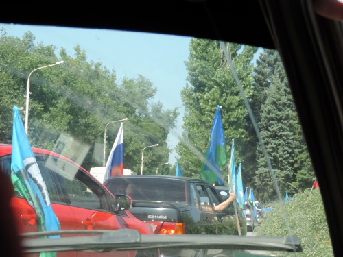 А у Ледового дворца машины с флагами и символикой ВДВ уже ждали участников автопробега. Нескончаемая музыка, автомобильные гудки, флаги, крики, песни, скандирование "Никто, кроме нас!"- всё это не могло не привлечь внимания горожан. Первым делом направились к мемориалу в поселке Красина, где возложили венок и цветы. Оттуда поехали на Артём и по другим мемориалам города.