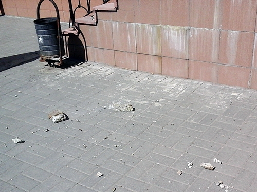 В доказательство предъявили мне собственноручное фото, сделанное, как утверждают, совсем недавно, на майские праздники. Лежат такие невзрачные камешеки на тротуаре перед четырёхэтажным домом на Советской, отделённым от 14-этажки рестораном "Рис". Как утверждает автор снимка, это был один здоровый каменюка, который на его глазах отвалился снизу от плиты балкона третьего этажа того самого дома, перед которым был сфотографирован, и разбился об тротуар. Спасибо, день был жаркий и солнечный, так что прохожие жались в тень на другой стороне улицы Советской, а иначе точно бы не миновать беды, убеждали меня.