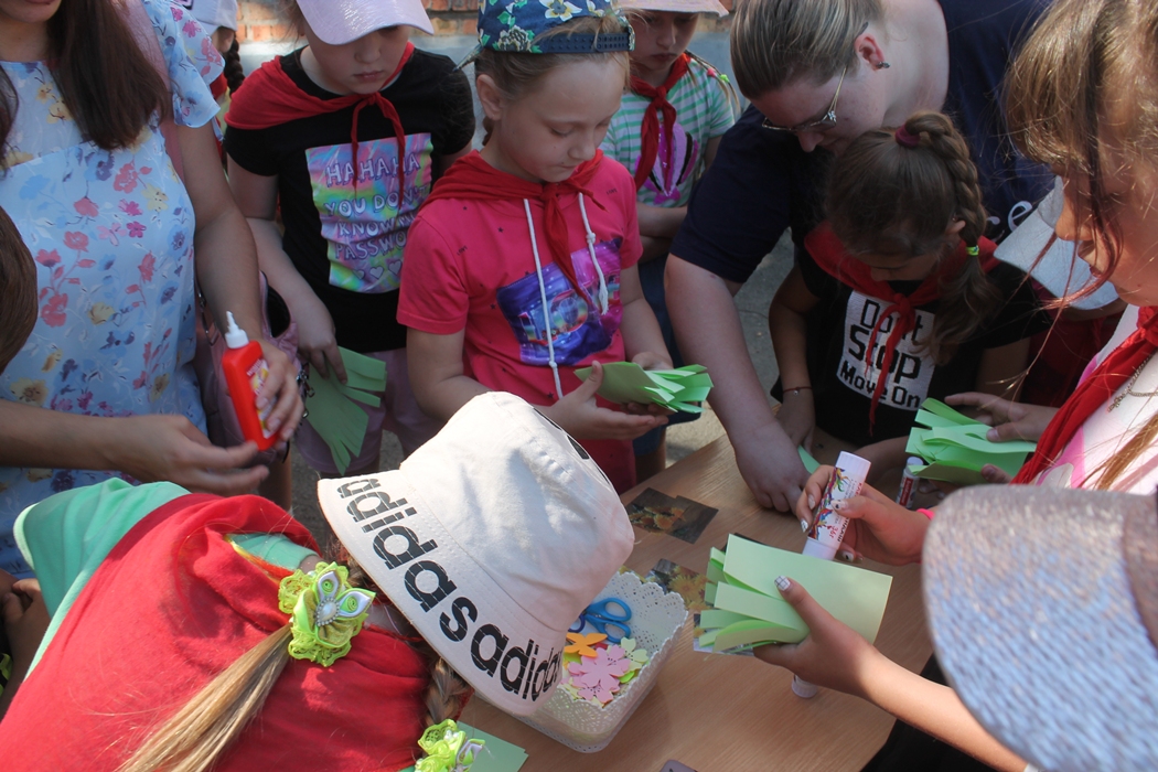 В школе N14 сегодня был День дружбы с природой. Сразу после зарядки ребятишки каждого из трёх отрядов летнего оздоровительного лагеря "Солнышко" собрались вокруг своих вожатых. Один отряд демонстрировал "домашнее задание" - подготовленные дома рисунки, а потом собирали картинки "про природу". Тут же рядом разбирали гербарий и слушали рассказ вожатой о полезных свойствах знакомых растений. А по-соседству клеили цветочные корзинки из бумаги. После завтрака в школьной столовой весь лагерь должен был отправиться в поход.