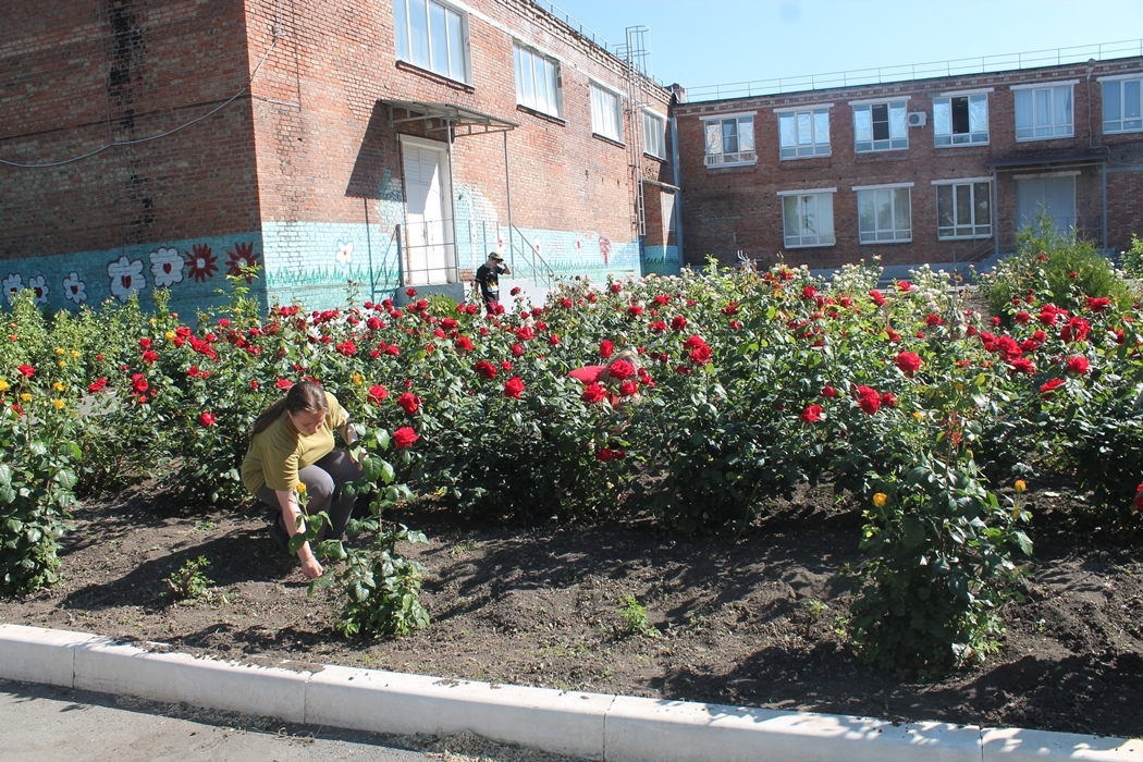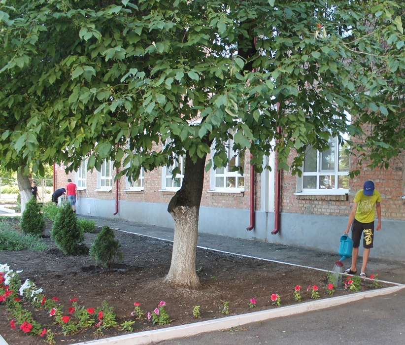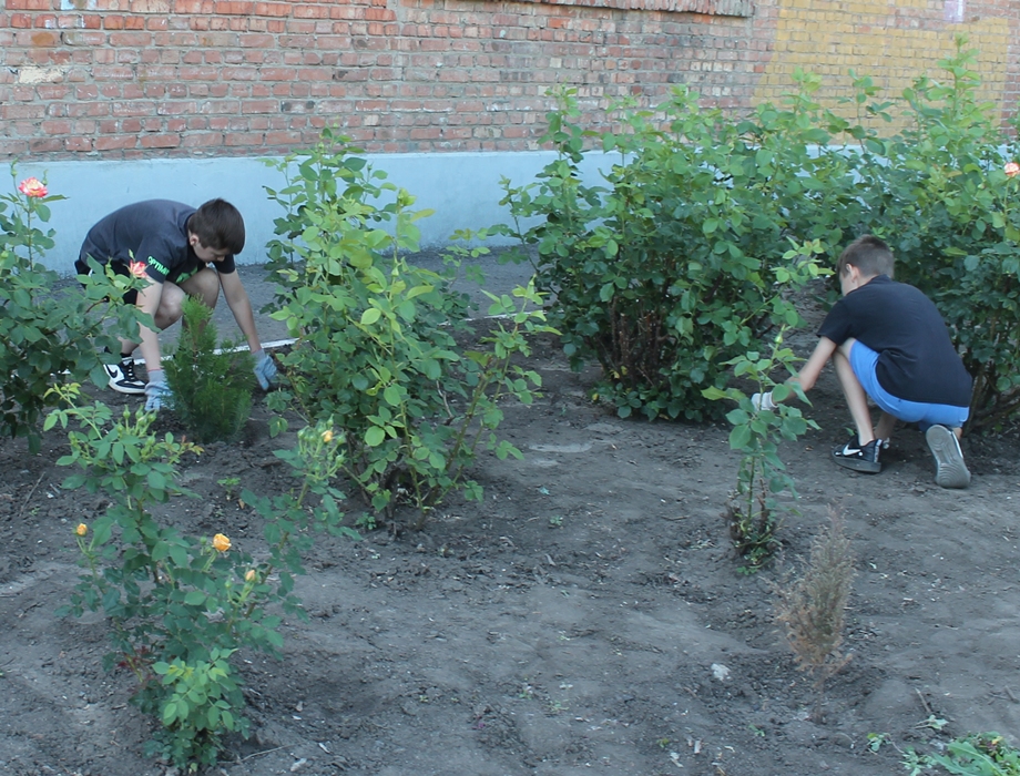 В это время ребята постарше, которые проходят трудовую практику, ухаживали за цветами: в школьном розарии - 500 кустов роз, нужно быть очень внимательными, чтобы не дать им превратиться в шиповник. Ну, и без полива, конечно, никак не обойтись.