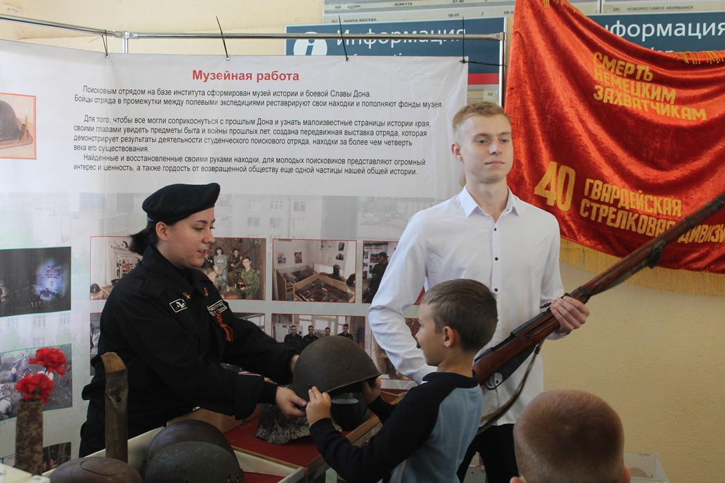Время сегодняшней стоянки "Поезда Победы" на станции Шахтная - с 10 до 18 часов. За этот промежуток, по словам начальника отдела молодёжной политики администрации города Ирины Борисенко, с уникальной музейной экспозицией смогли ознакомиться около 800 ребят из шахтинских школ, чтобы потом рассказать в своих школах об увиденном и услышанном. А перед тем, как пройти по музейным вагонам, школьники в здании вокзала могли увидеть мини-экспозиции, которые представили поисковый отряд "Ратобор" Шахтинского филиала ДГТУ и городской краеведческий музей.